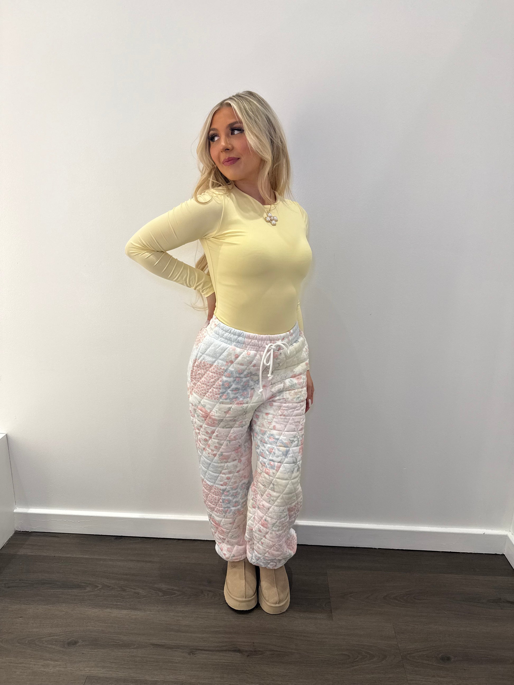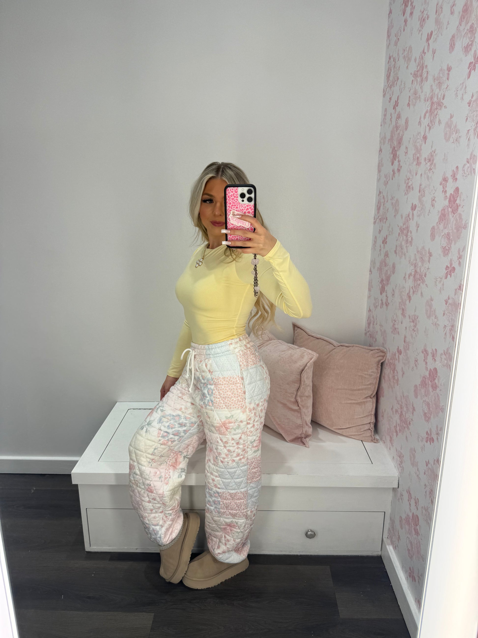 Get cozy in style with our Bluey Patchwork Pant. These cuffed floral sweatpants are perfect for staying warm on chilly days, with a mix of pinks and blues that will brighten up your wardrobe. Let these pants add a touch of flair to your closet.