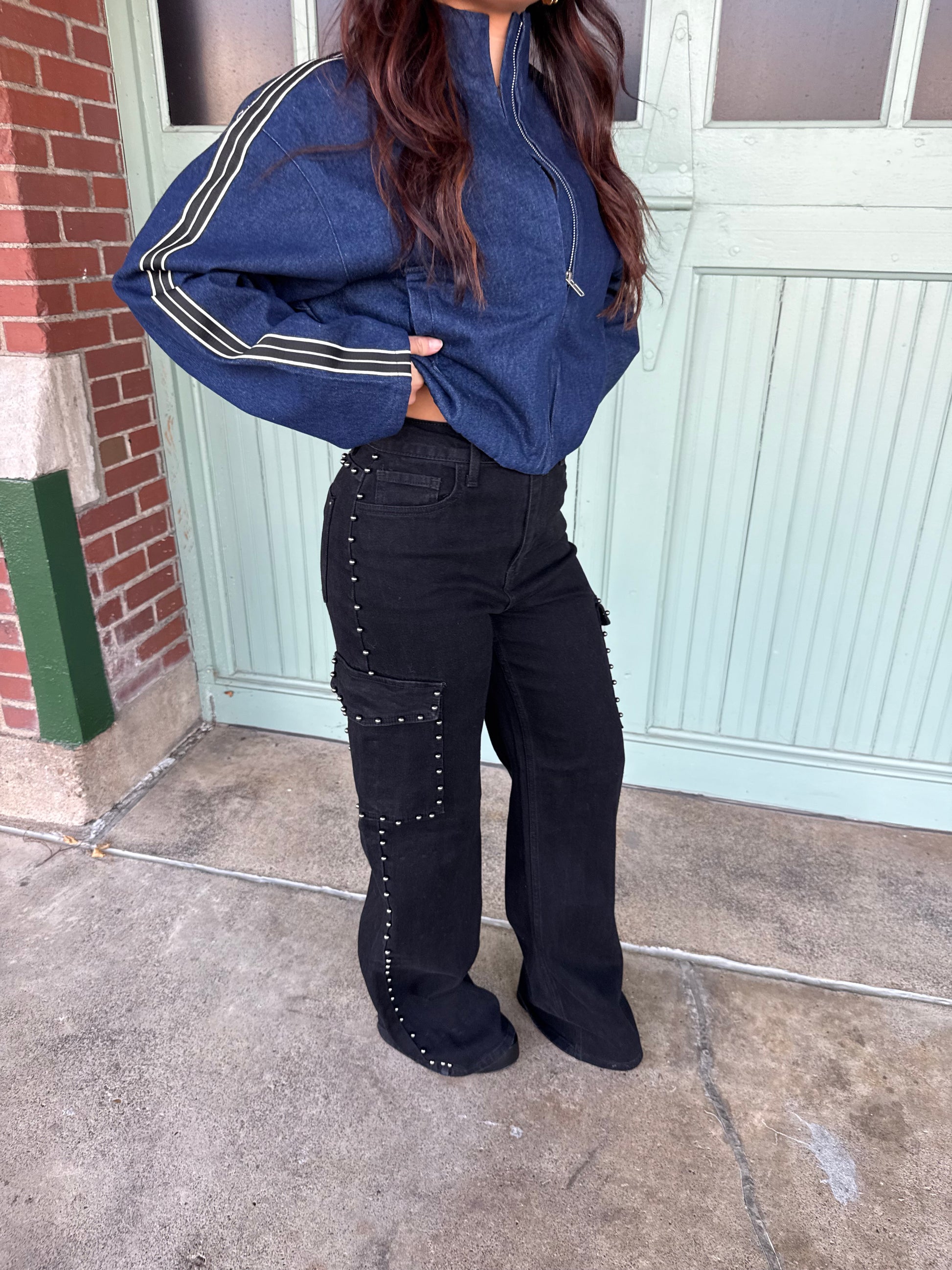 "Step up your denim game with our Cargo Onyx Studded Jean. This mid-waisted black denim features unique studded cargo pockets, adding an edgy touch to any look. Don't settle for basic, elevate your style with our one-of-a-kind jean!"