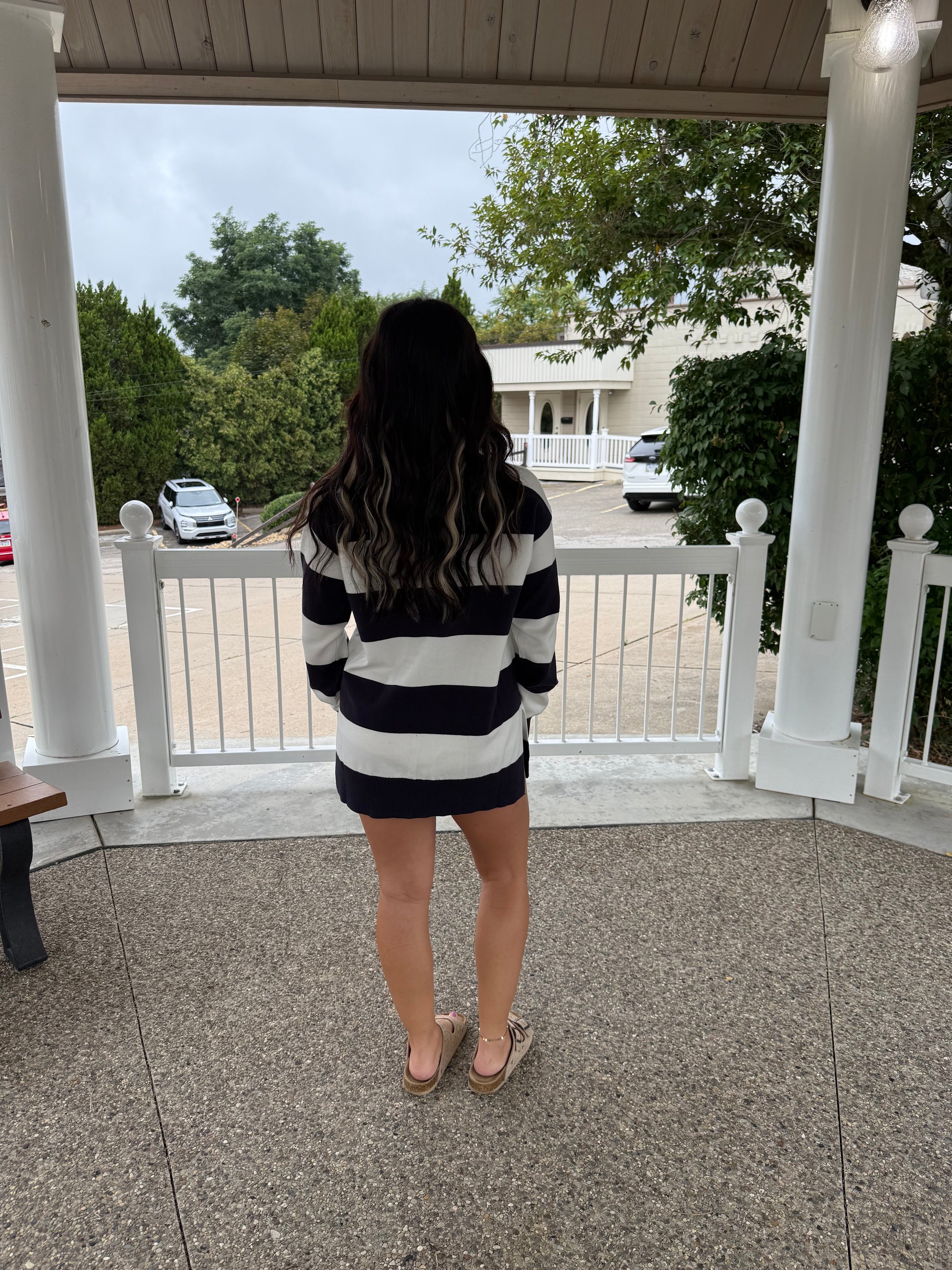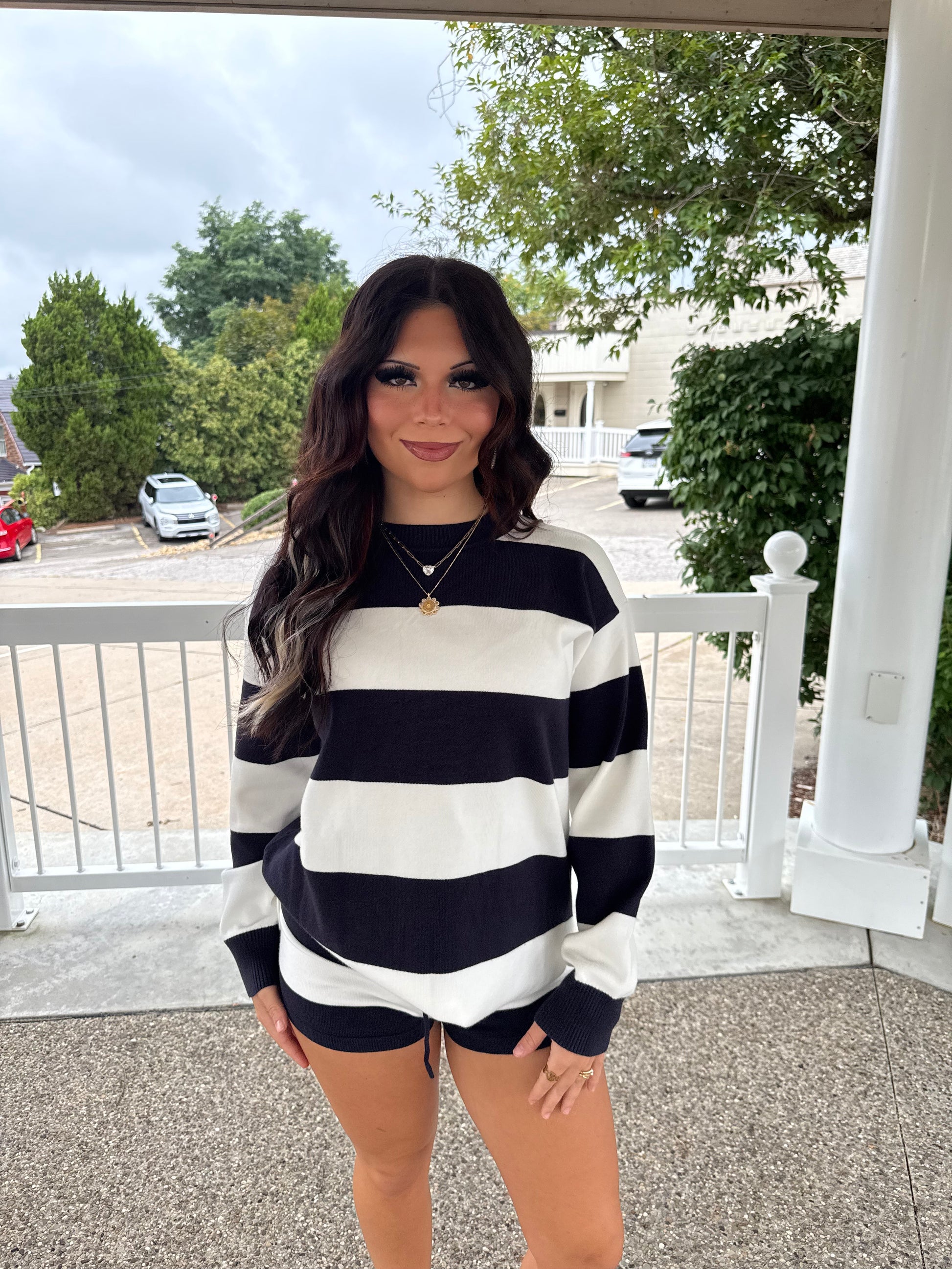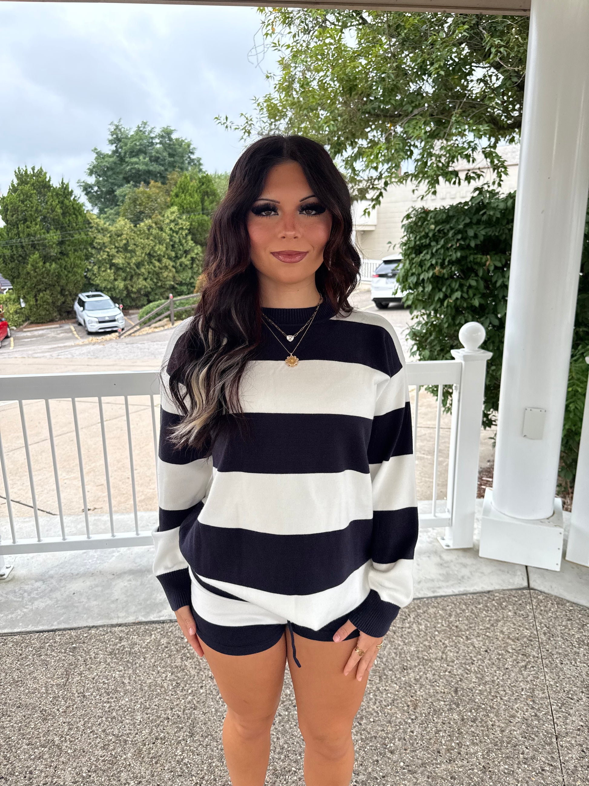 "Stay cozy and stylish in our Cozy Posey Set, featuring a soft and stretchy navy blue and white sweater with playful stripes. Perfect for a laid-back yet fashionable vibe (without sacrificing comfort)!"