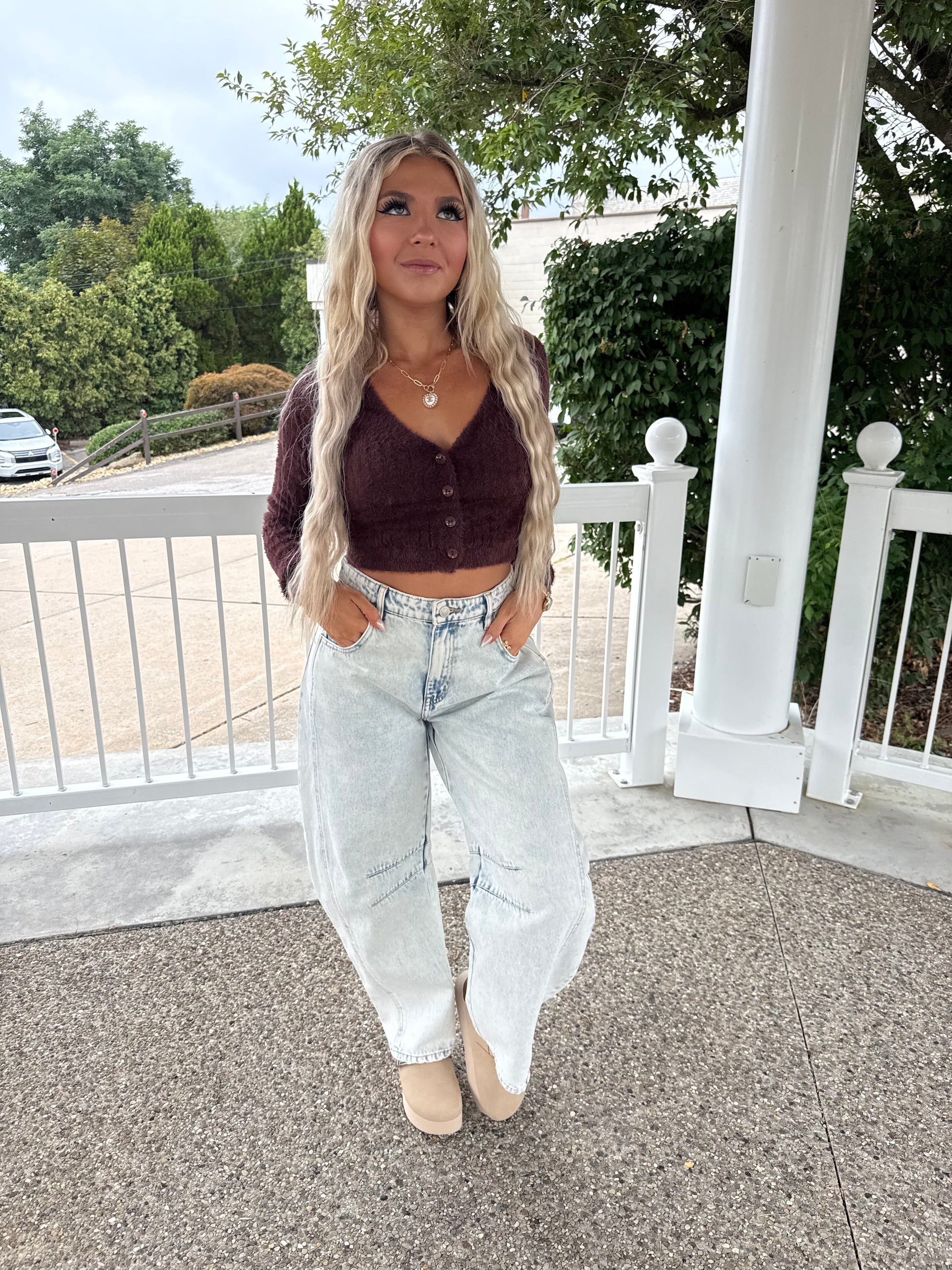 Indulge in the luxurious warmth and style of our Dark Chocolate Fuzzy Cardi. This cropped cardigan sweater is made from ultra-soft, fuzzy fabric in a unique deep brown color, perfect for the cooler autumn weather. Elevate your look and stay cozy at the same time with this must-have top!