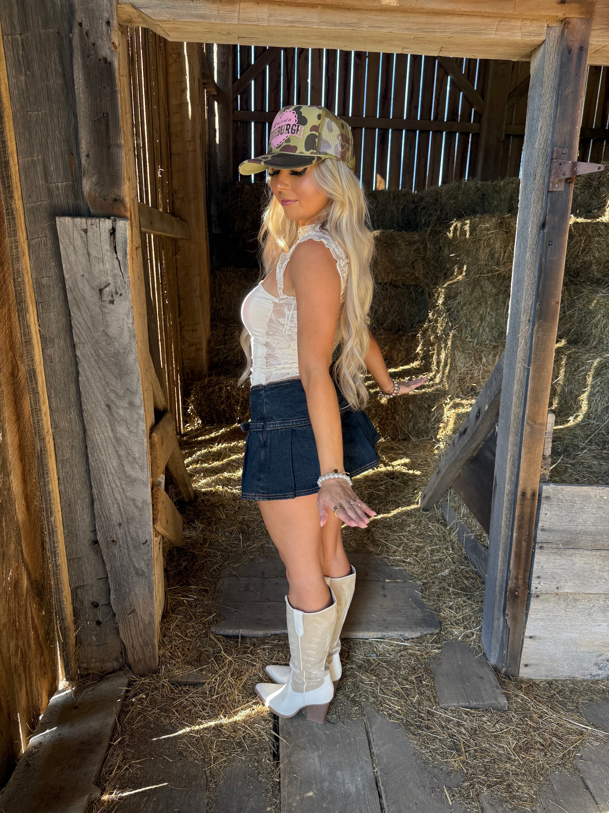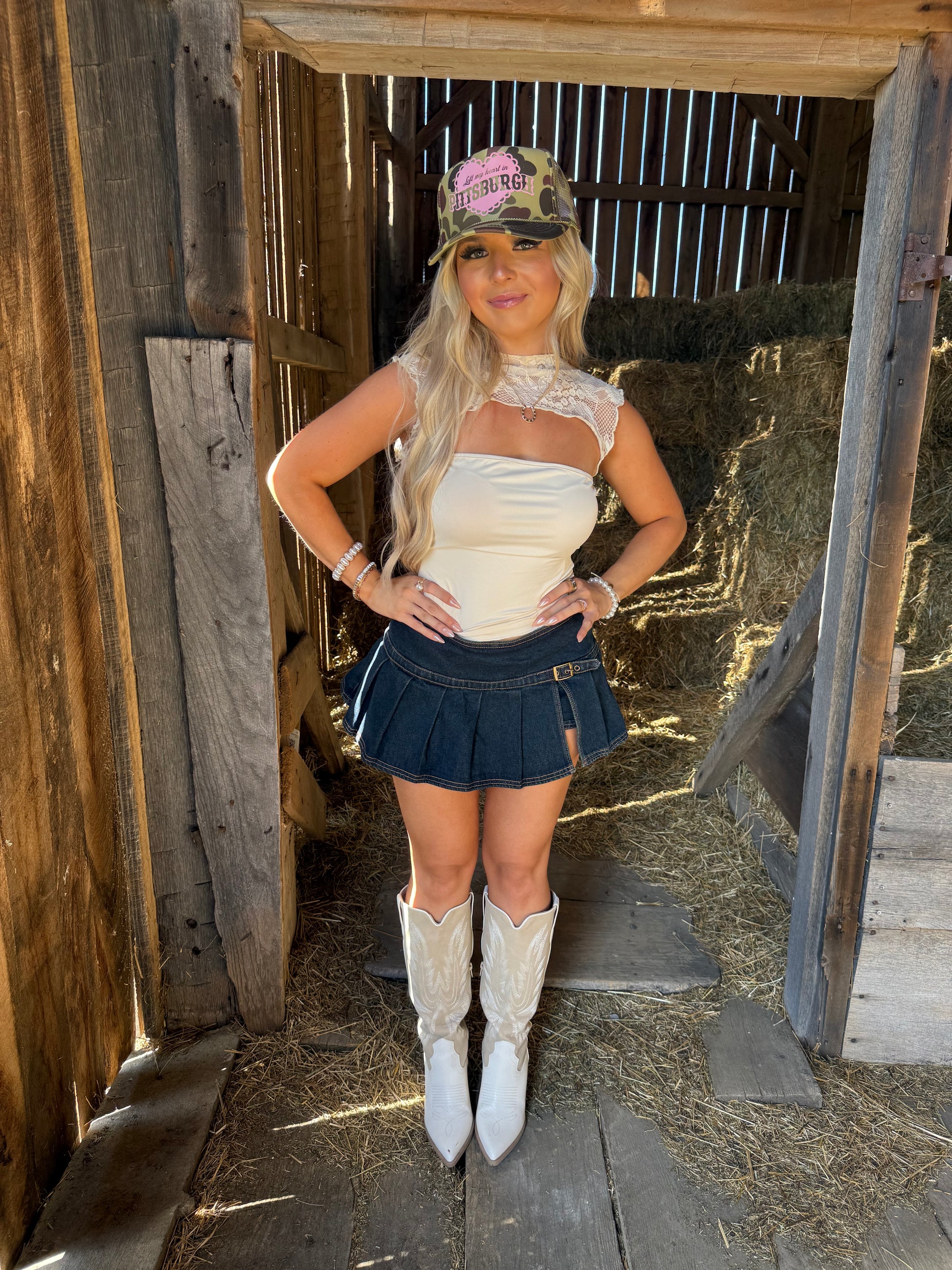 The Don't Tell Em Skirt in Dark Blue is a perfect addition to your fall wardrobe. Made with durable denim and featuring a stylish mid rise fit, this skirt is both cute and functional. Complete with a chic gold buckle, it's the ideal choice for school or a fun outing.