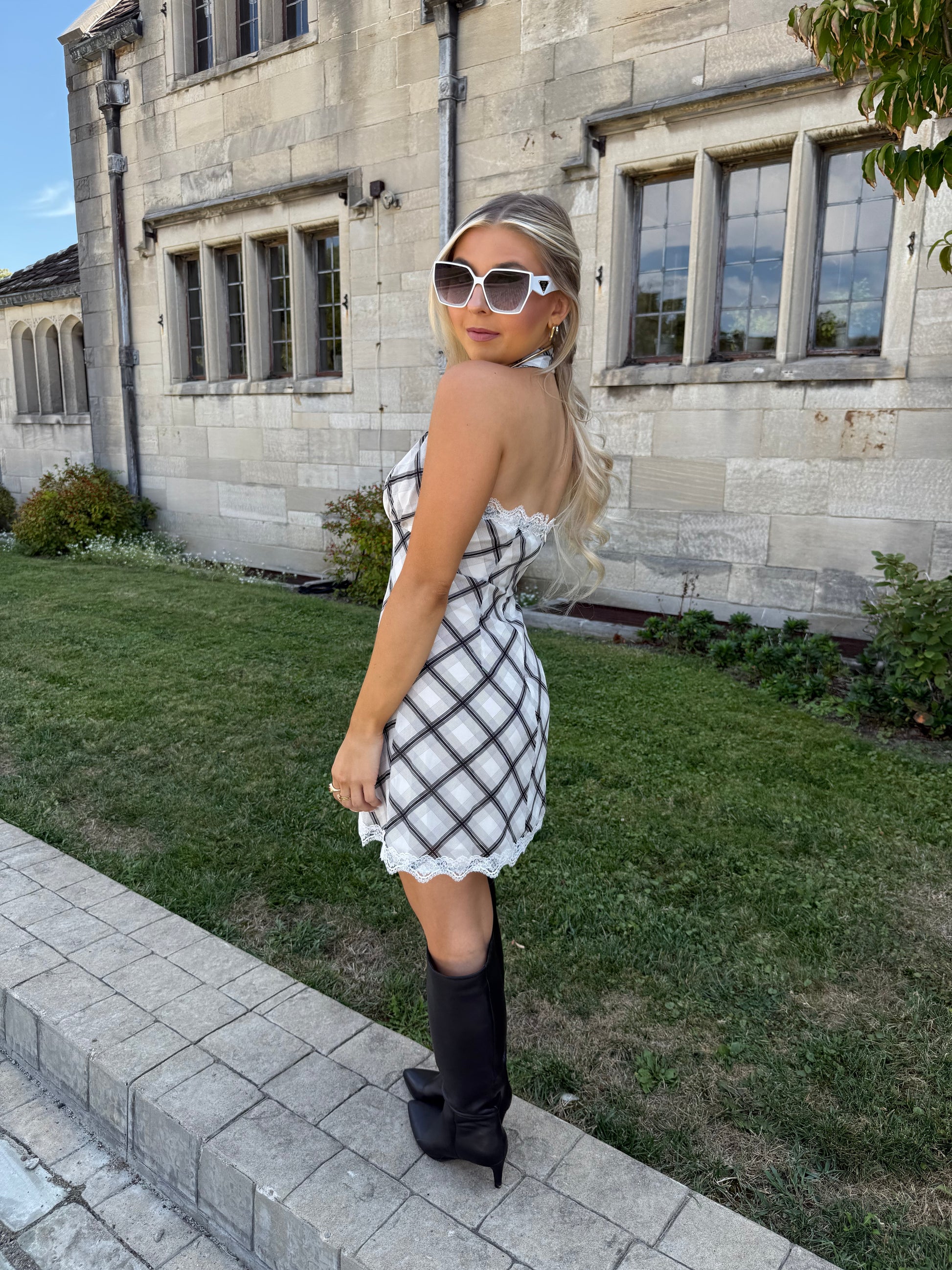 Introducing the Fall Tings Dress - a halter-style dress featuring a unique plaid pattern and gorgeous lace detailing. With its double-lined design, this dress offers both style and comfort. The zipper feature also adds an extra touch of convenience. Elevate your fall wardrobe with this must-have dress!