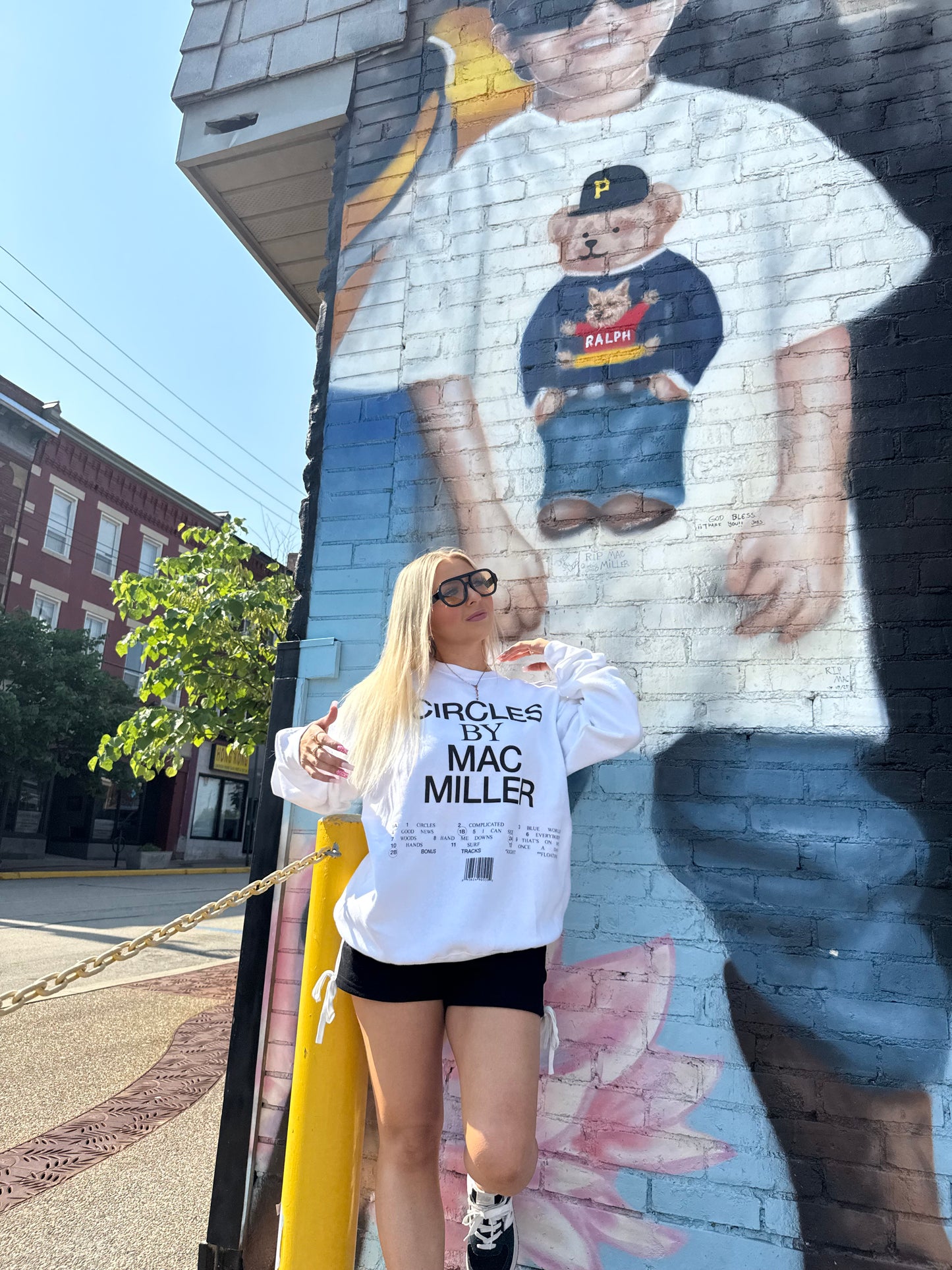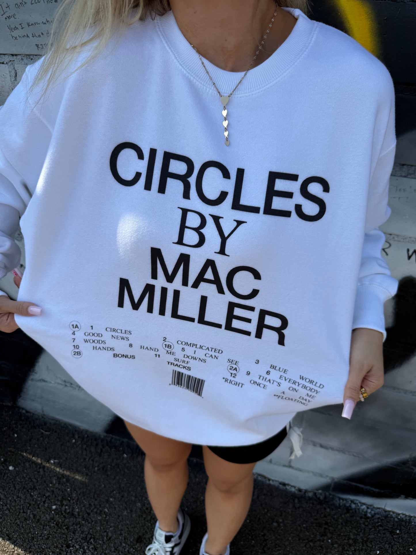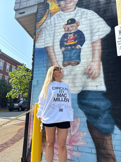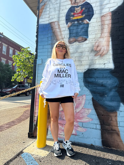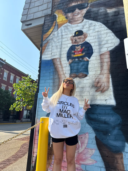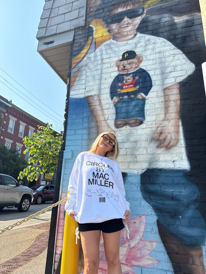 Experience comfort (and some sick beats) with the Mac Miller Circles TrackList crewneck in fresh white. Featuring Mac Miller's iconic black wording, you'll be both stylish and comfortable. Get ready to jam out with this unique and cozy piece!