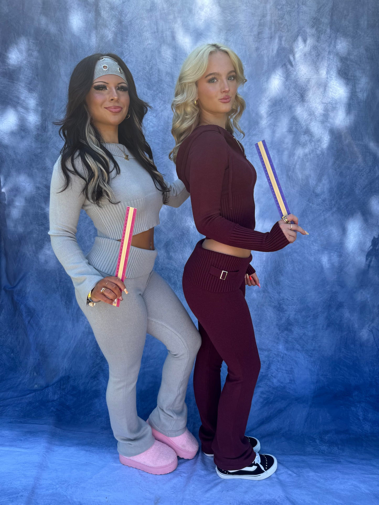 Add a stylish twist to your wardrobe with the Ring Pop Black Cherry Sweater Set. These pants are made from soft sweater material and feature a unique waistband with a fashionable silver buckle. The stretchy design provides comfort and versatility for any occasion. Upgrade your look with these maroon pants and achieve a matching look by pairing them with our Ring Pop Black Cherry Sweater Set Top (sold separately).