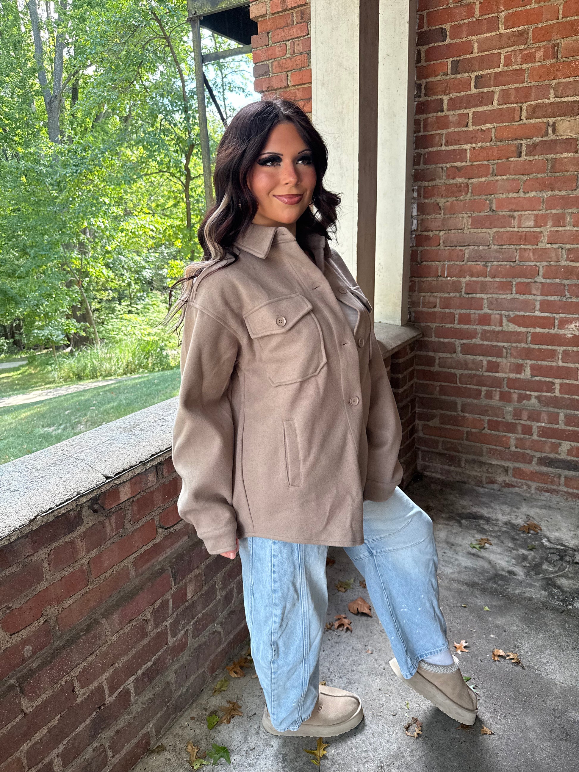 Introducing the perfect addition to your fall wardrobe - the Shopping Addict Shacket in Taupe! This versatile piece combines the style of a shirt with the warmth of a jacket, featuring a button-up design, cozy pockets, and a thick material to keep you comfortable during the cooler months. Upgrade your fashion game with this must-have shacket!
