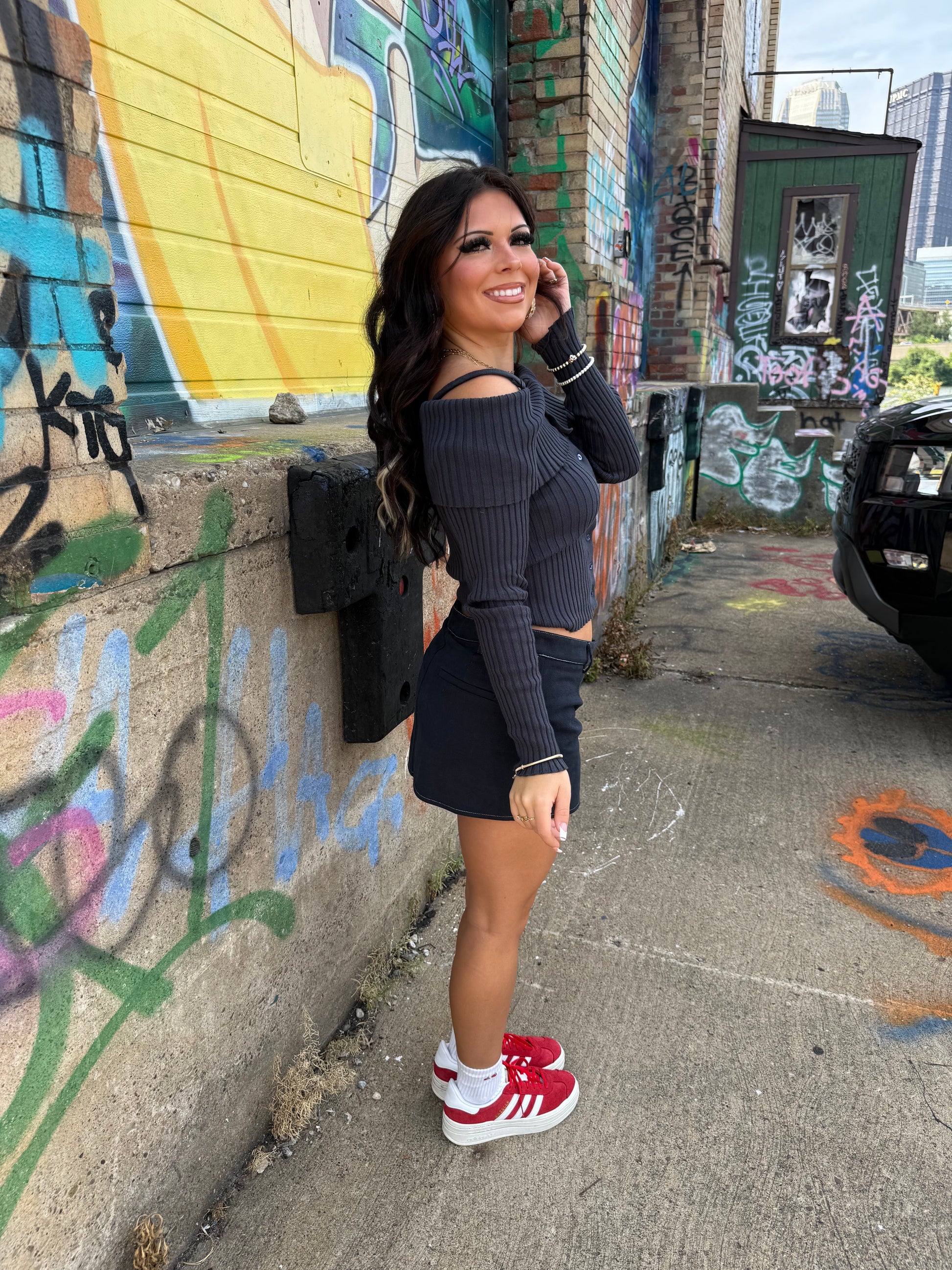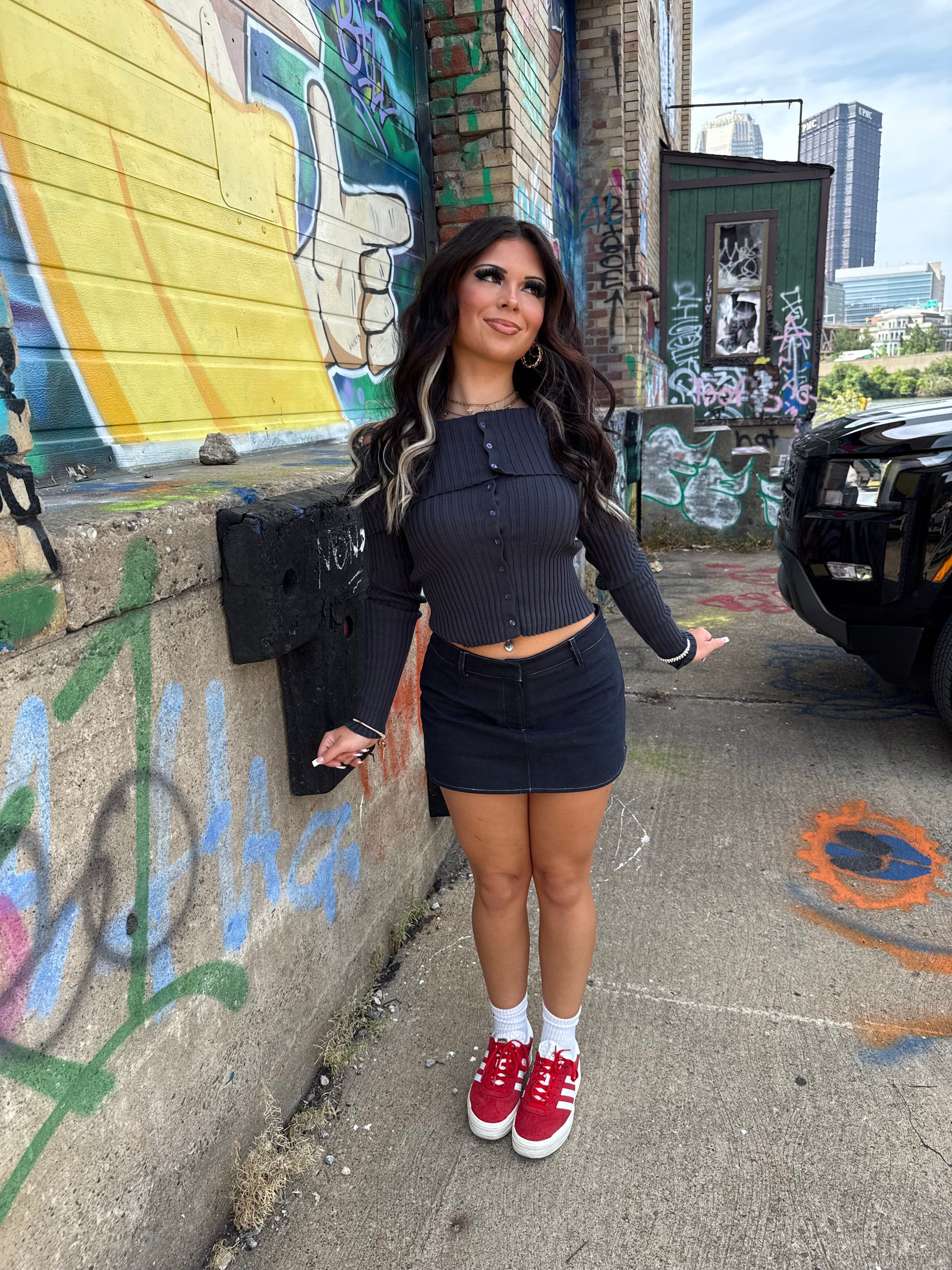 "Stay comfy and cool with our Stone Cold Navy Sweater. This stretchy and stylish sweater features off shoulder design and buttons for an edgy look. Perfect for any occasion, from work to weekend plans. Get ready to rock this trendy top!"
