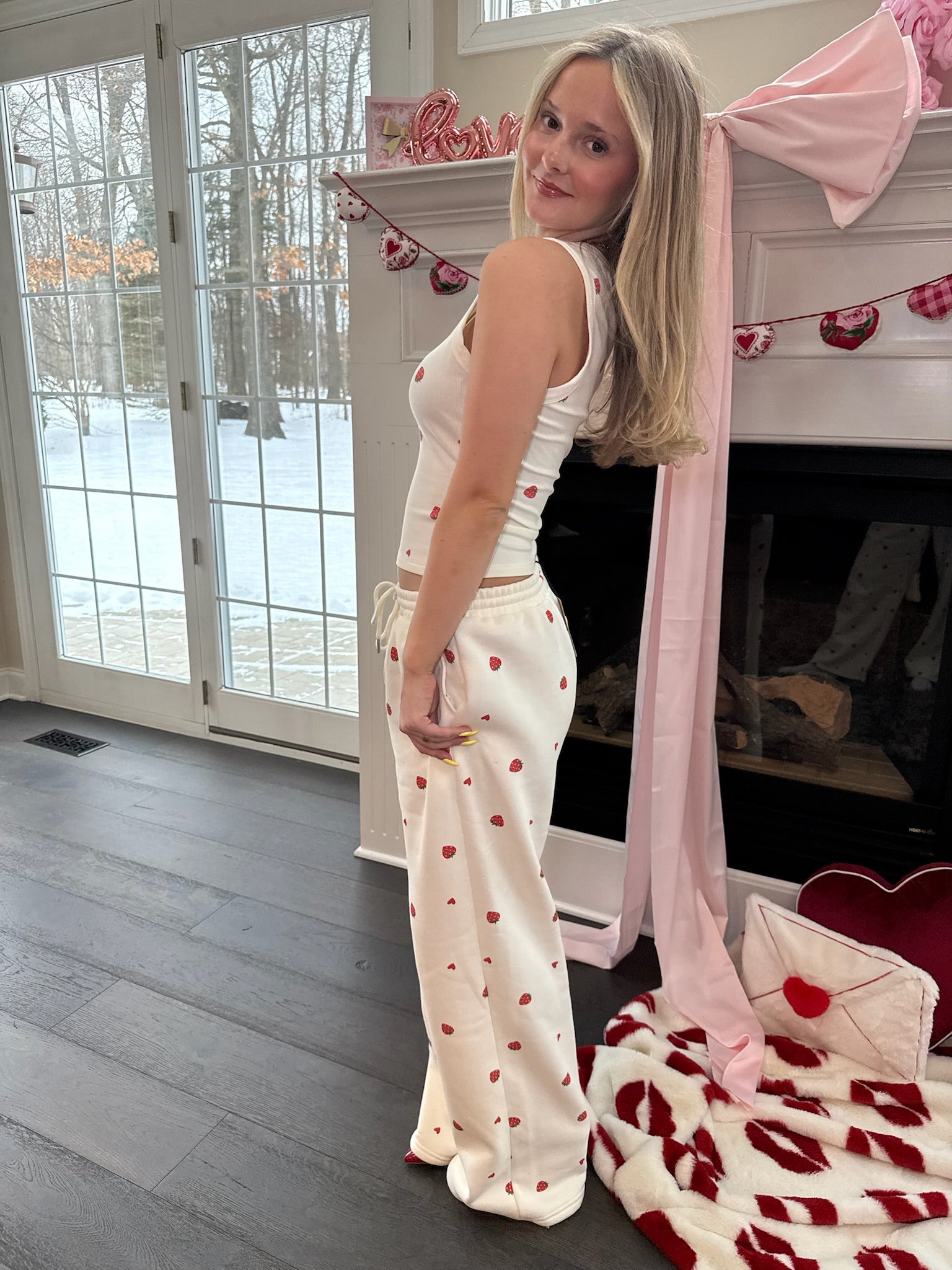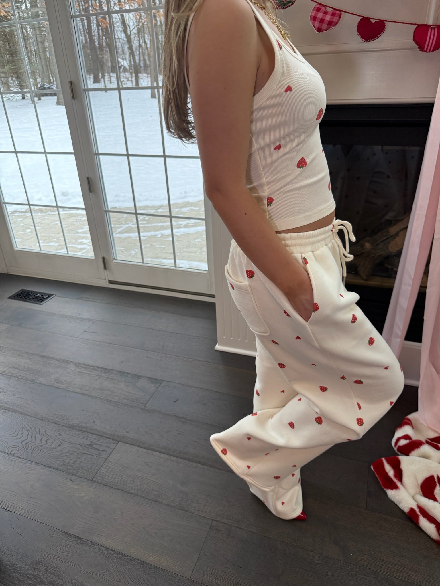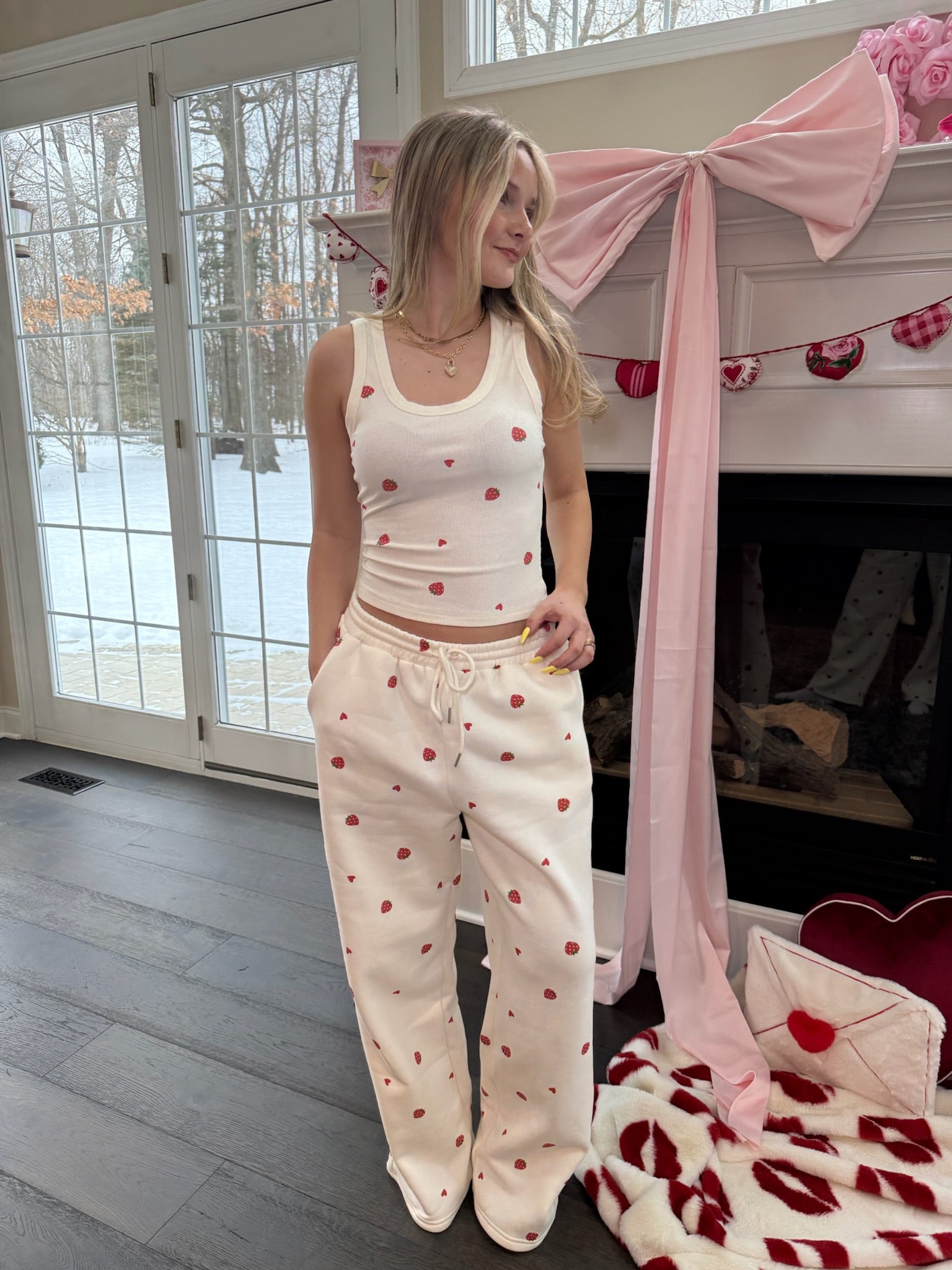 Enjoy a sweet and cozy vibe with our Strawberry Fields Set Pants! These sweatpants feature a soft and thick fabric, convenient pockets, and a playful strawberry and heart design. Stay comfy with a wide leg fit, elastic waistband, and adjustable drawstring. Achieve a matching look by pairing these sweats with our Strawberry Fields Set Top, sold separately.