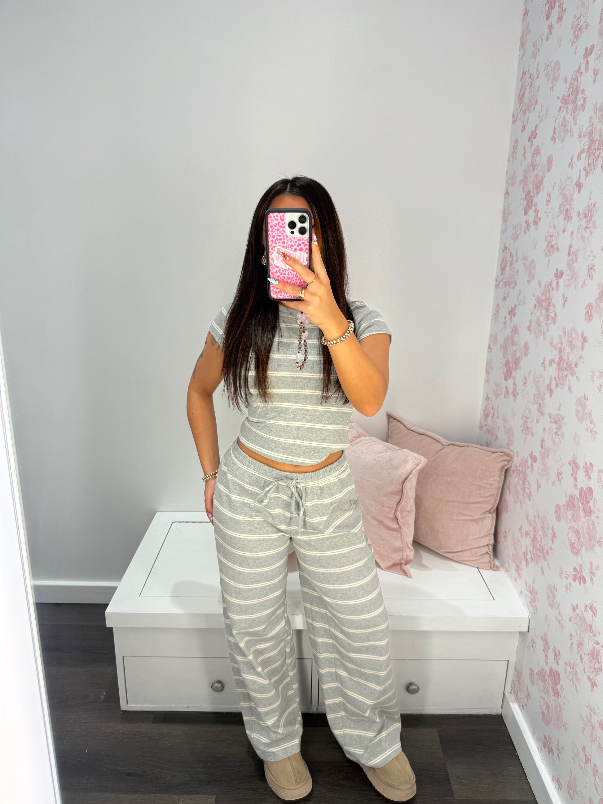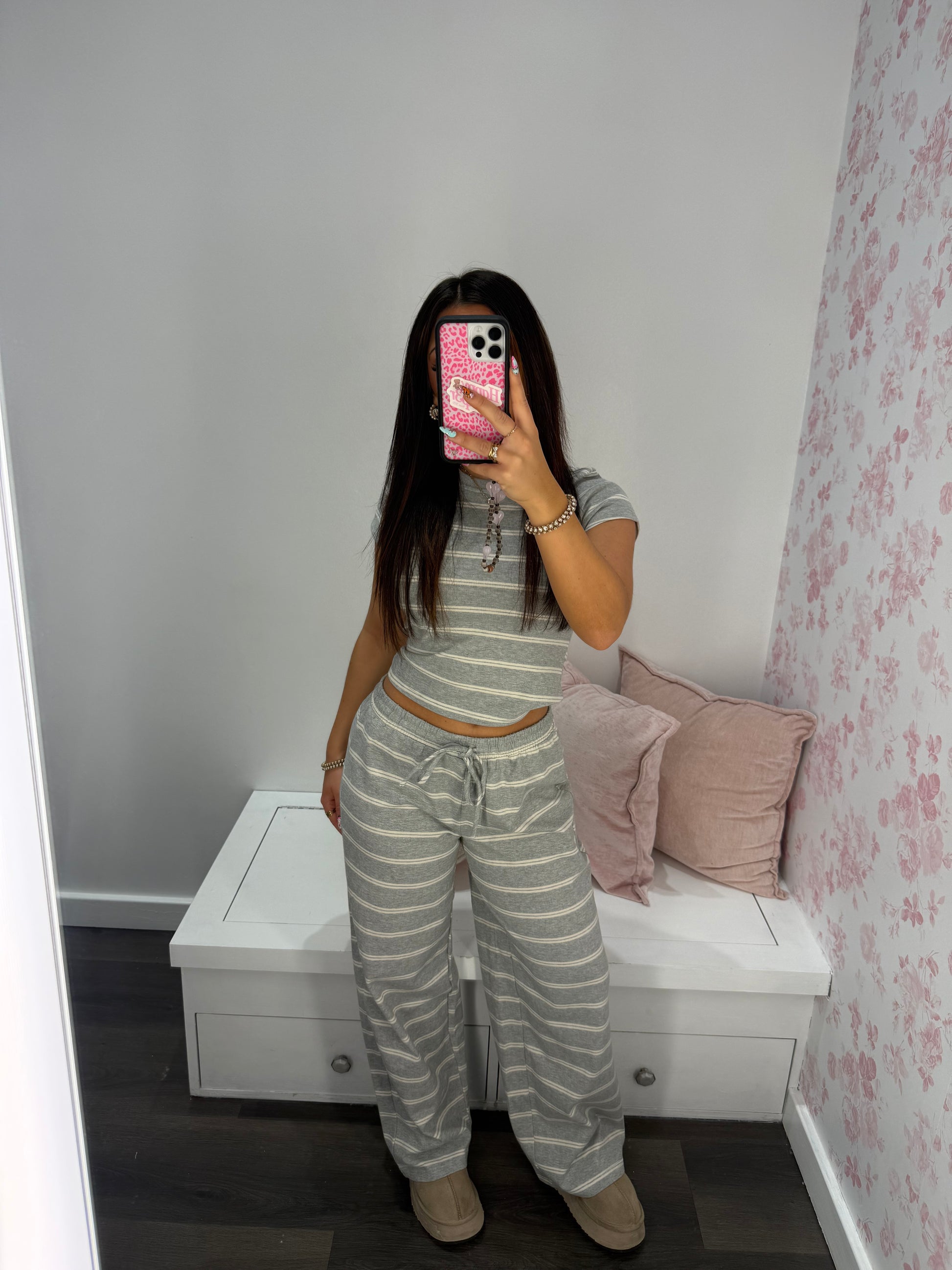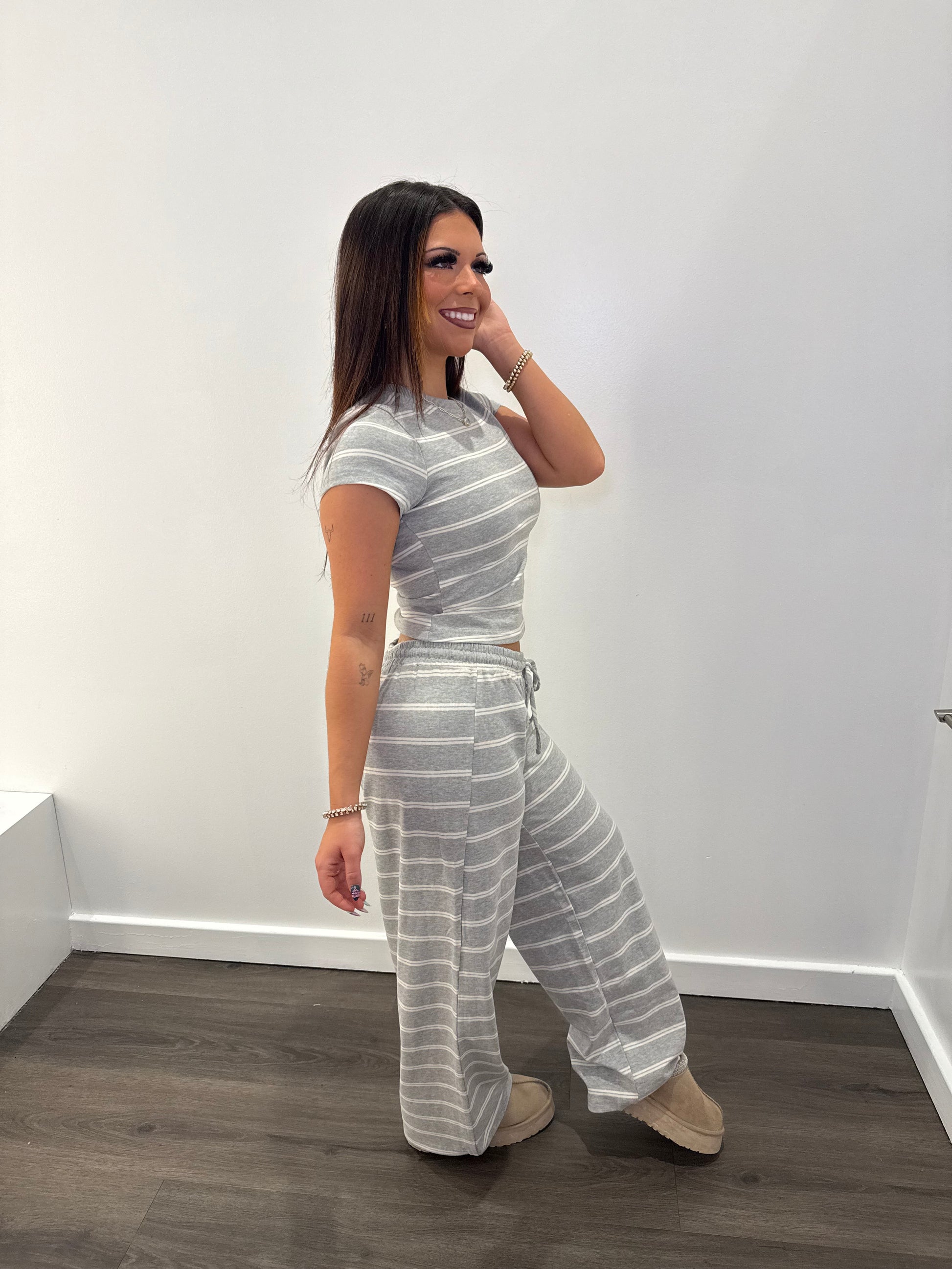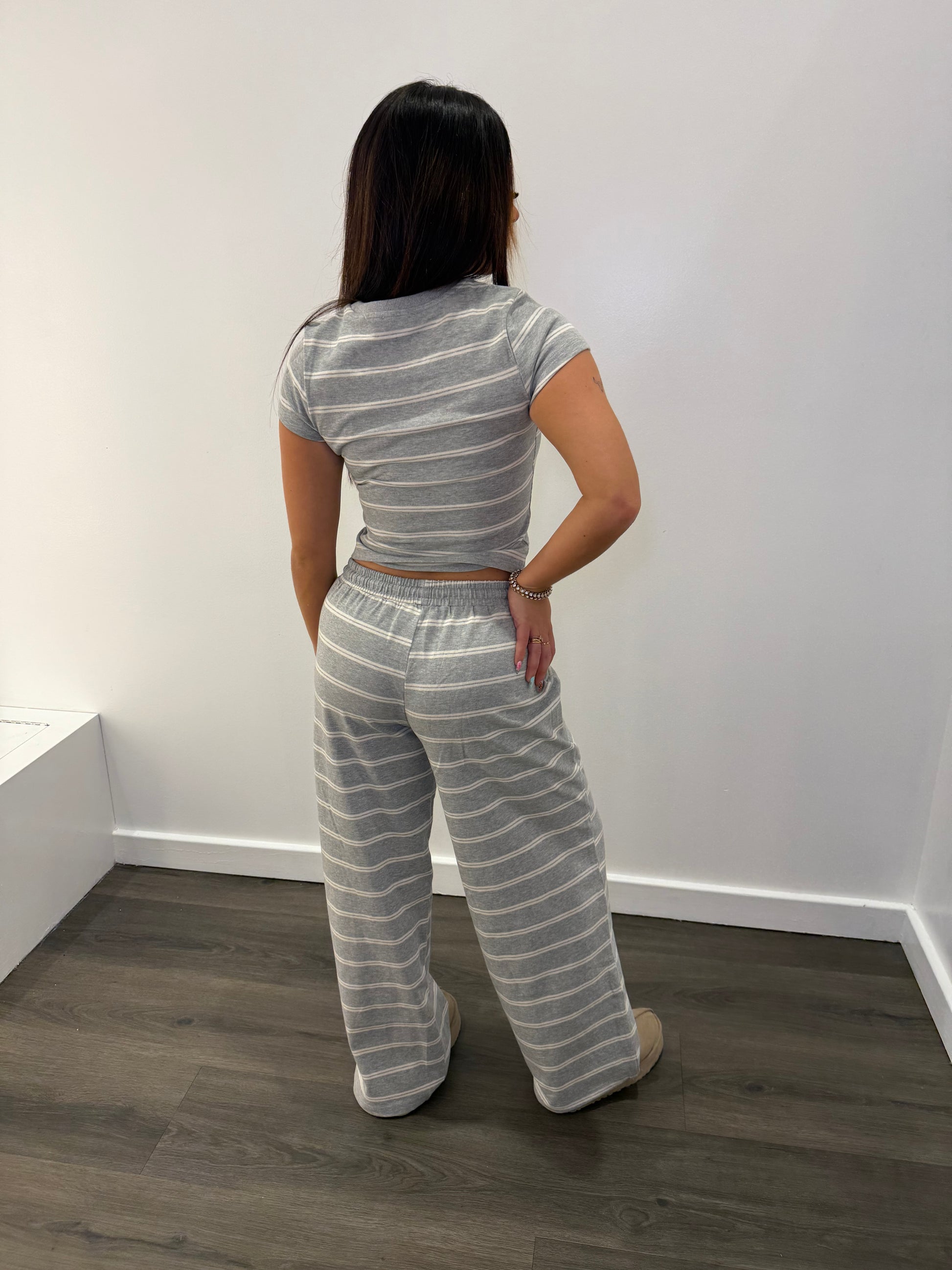 Get ready to relax and unwind with our Time To Unwind Set (TOP)! This playful and stylish set features a grey and white striped design, with fitted and cropped shorts and a short-sleeve top. Perfect for those days when you just want to kick back and enjoy some well-deserved comfort.