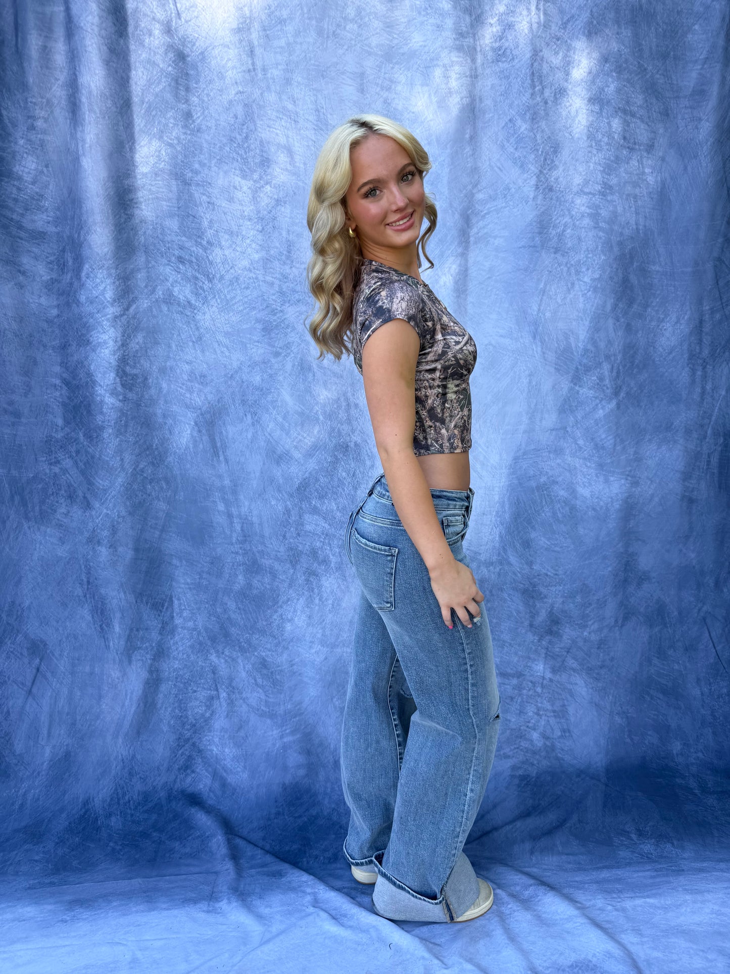 These Wide Cuff Cut Denim jeans combine a trendy light wash denim with a delicately ripped knee for a stylish yet edgy look. The cuffed bottoms and wide leg design offer both comfort and versatility, making them a must-have addition to any wardrobe.
