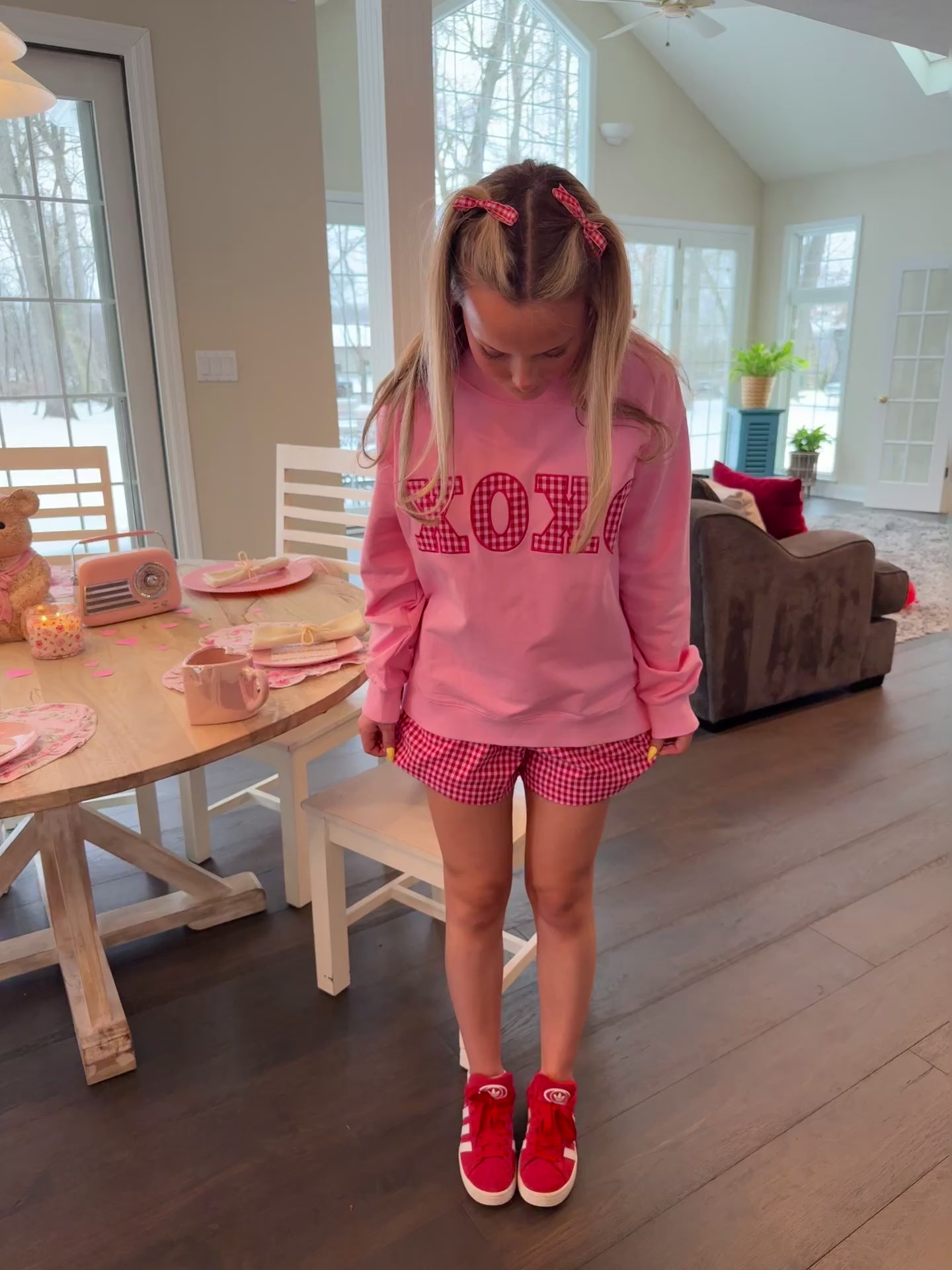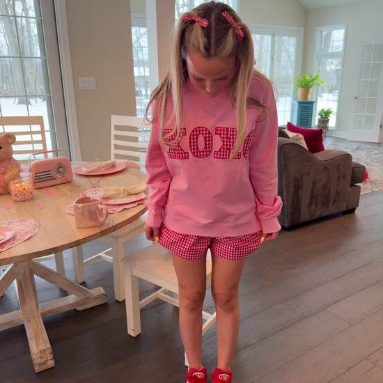 !! FINAL SALE !! Add a pop of color to your VDAY wardrobe with our XOXO Gingham Mockneck. The bright pink color and embroidered detailing make this long sleeve top a standout piece. Its oversized fit and mock neck provide both comfort and style. For a complete look, pair this top with our matching XOXO Gingham Shorts, sold separately.